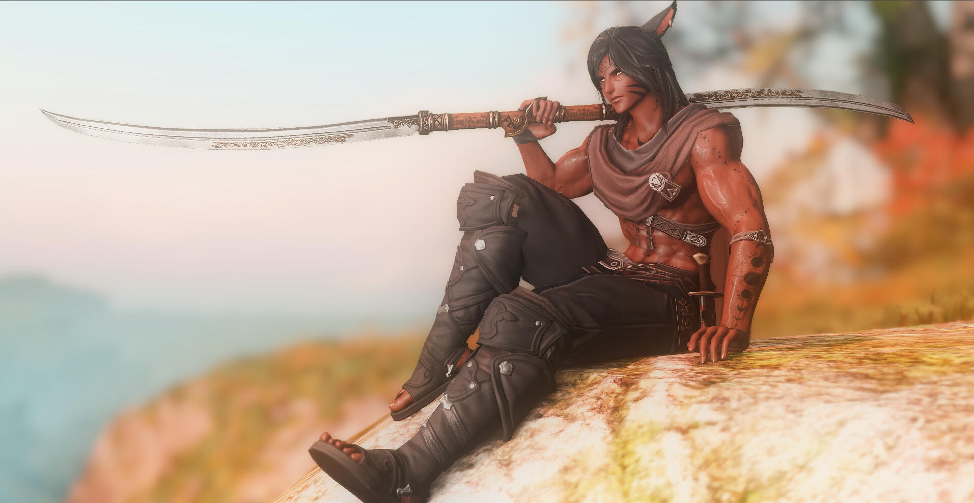 • novice: -• misc. skills: Memory retention, learning, stealth, perception, investigation, athletics, acrobatics, sword-craft, survival, natural lore, animal handling, Old Amdapori, mathematics❝ COMBAT STYLE - Frontline Striker / ProtectorMihn'li favours offensive ability and decisive action to end a fight before its prolonging causes undue harm. Speed, agility, wits and precision are his greatest strengths; he is capable of evaluating, observing and maneuvering around opponents quickly, striking at vulnerable points to systematically pick apart defences.While he is competent with sword, shield and bow, his favored weapon is the twinblade; his is a fighting style refined by his Sentinel cadre over millennia studying the manifestations of the Elder Primal Odin. At need he will invoke the Dark Divinity's essence and draw from arcane tattoos a pair of all-sundering egi-blades, becoming a blur of deadly motion on the battlefield.